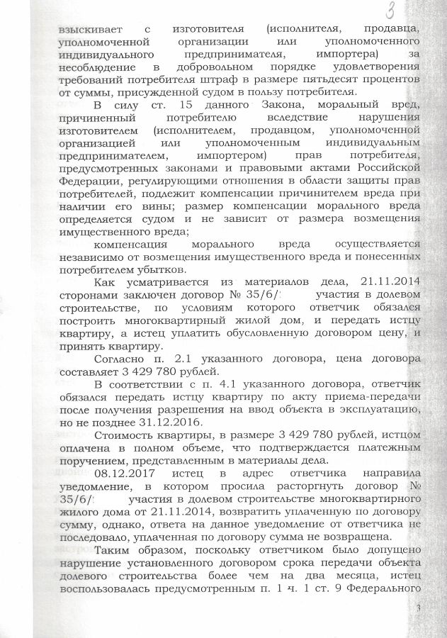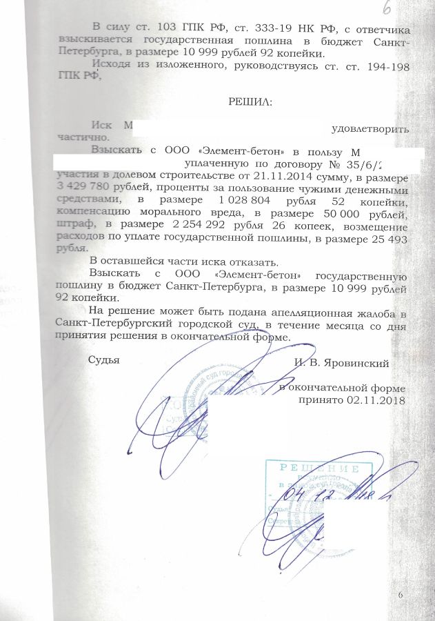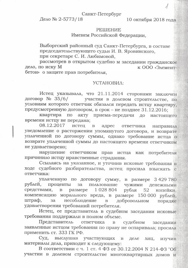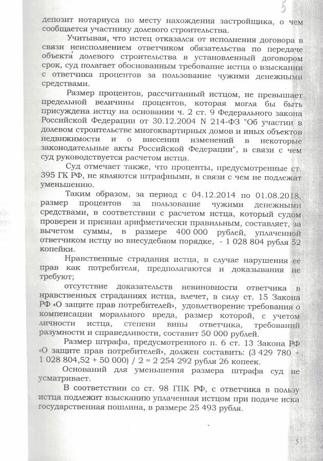 В данном случае, суд присудил хорошие суммы компенсаций, которые соразмерны стоимости самой квартиры, однако получить эти суммы с застройщика затруднительно, поскольку застройщик находится в предбанкротном состоянии.