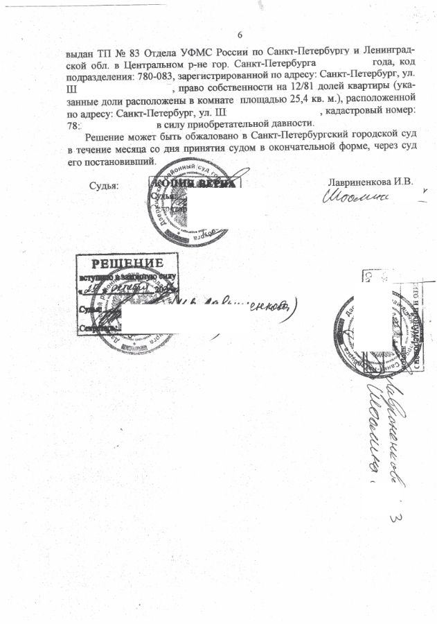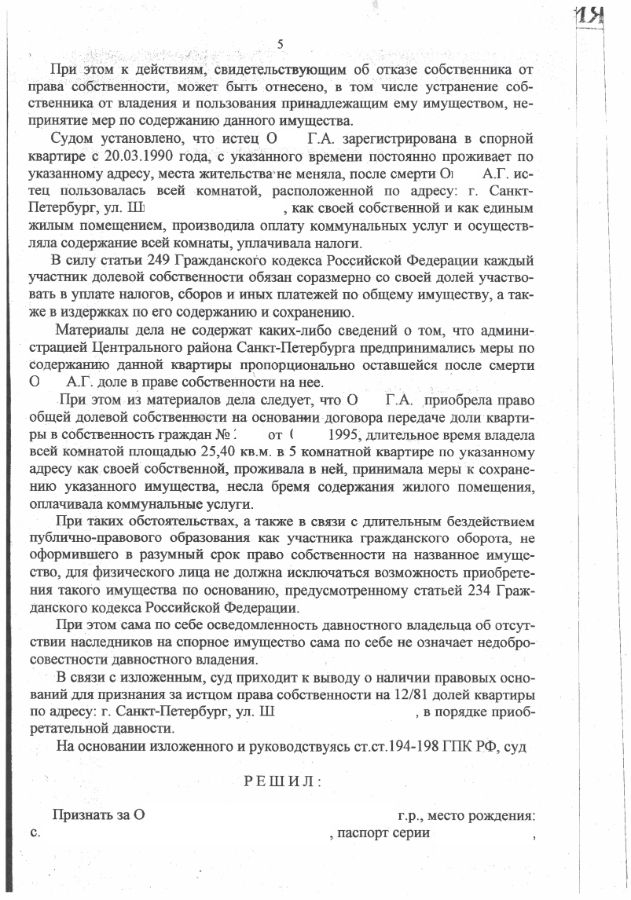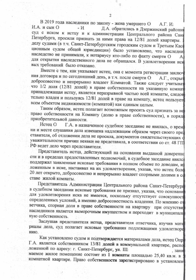 Истец (мой доверитель) владела и пользовалась комнатой в коммунальной квартире. При этом половина комнаты принадлежала ей, а вторая половина комнаты ранее принадлежала другому человеку, который умер в 2002 году. После смерти второго собственника за наследством никто не обращался, в связи с чем половина комнаты перешла в ведение администрации Центрального района Санкт-Петербурга.