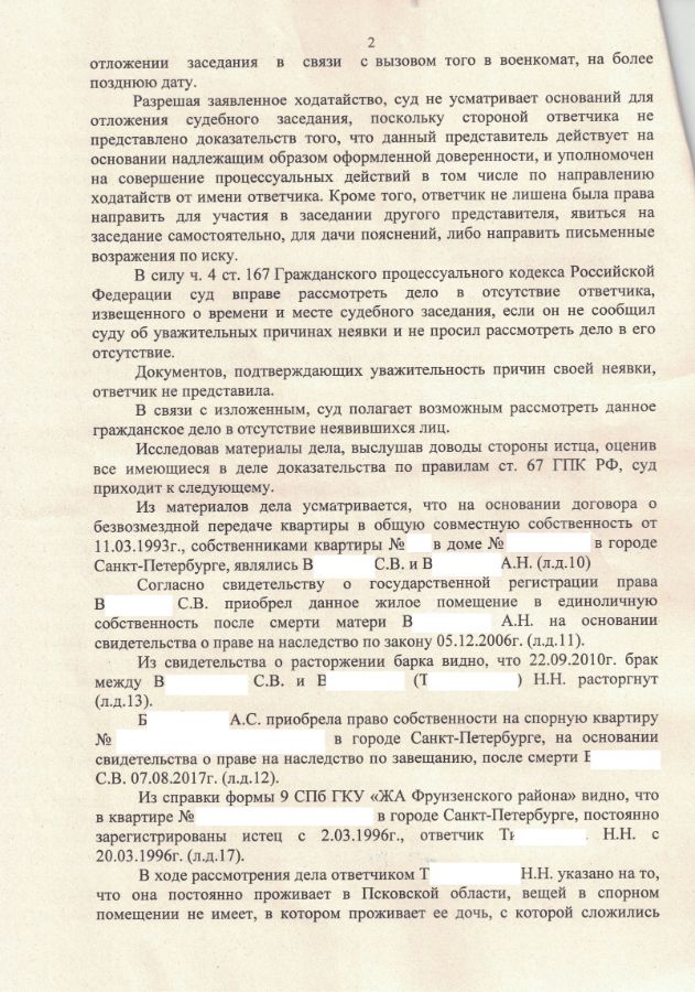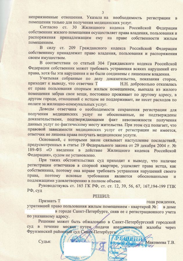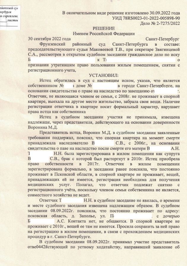 Решение Фрунзенского районного суда о снятии с регистрационного учёта близкого родственника, официально не имеющего другого жилья