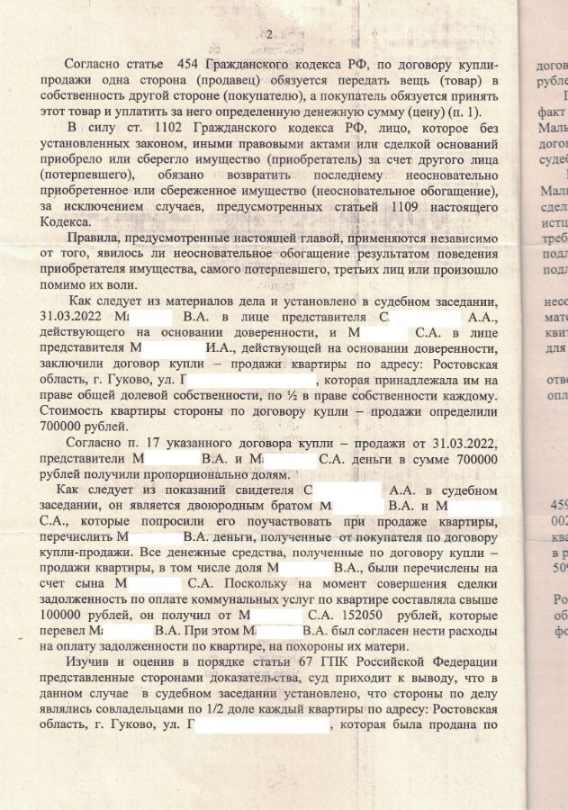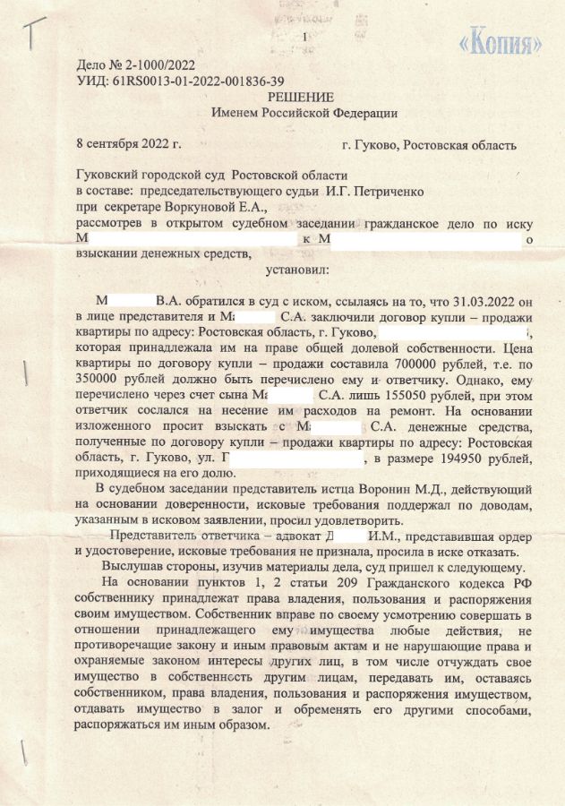 Воронин М.Д. представлял интересы истца. Ответчик и истец унаследовали квартиру. Ответчик квартиру продал, деньги выплатил истцу не полностью, ссылаясь на расходы.