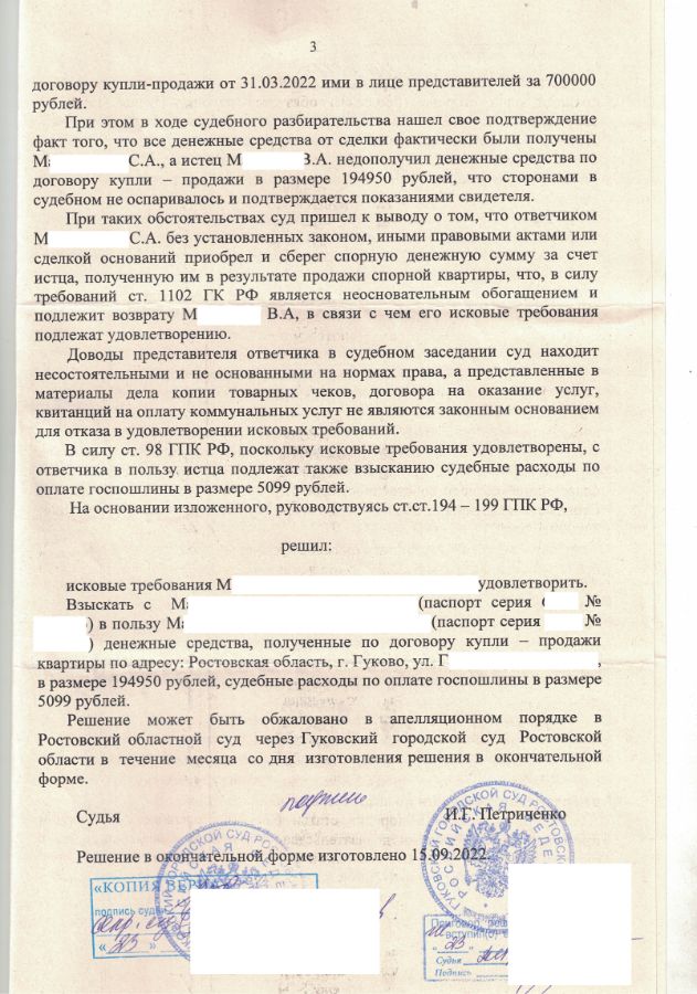 Истец обратился в суд и взыскал с ответчика деньги. Заседания проходили по видеоконферренцсвязи через Выборгский районный суд Санкт-Петербурга. Текст решения: