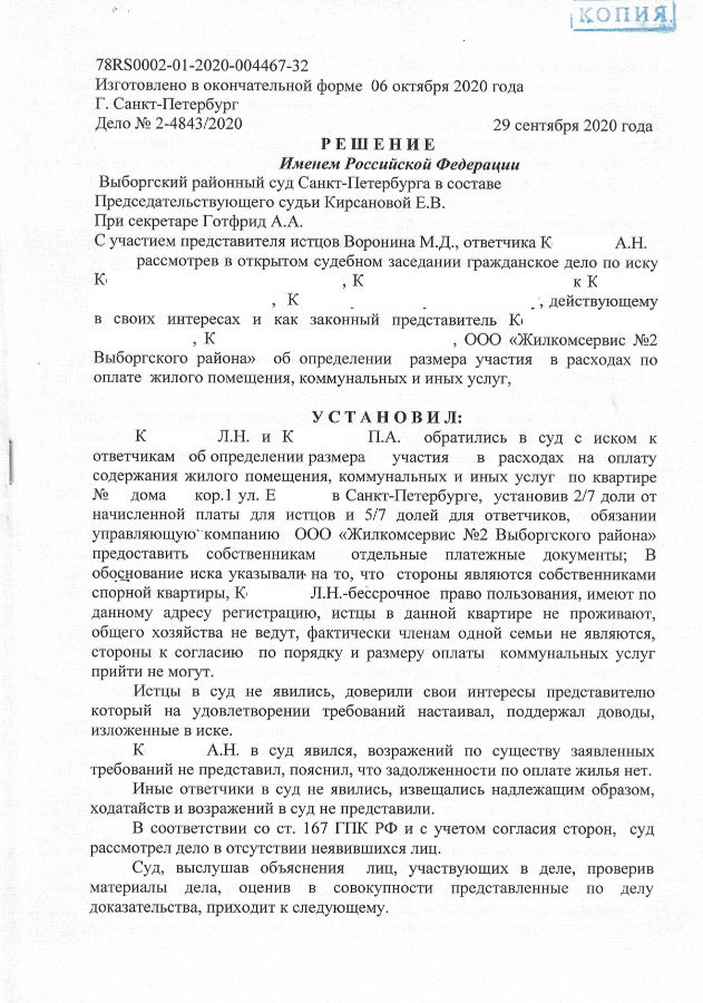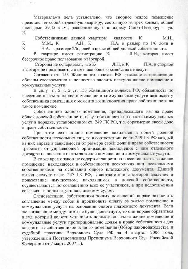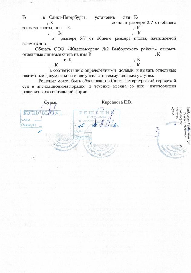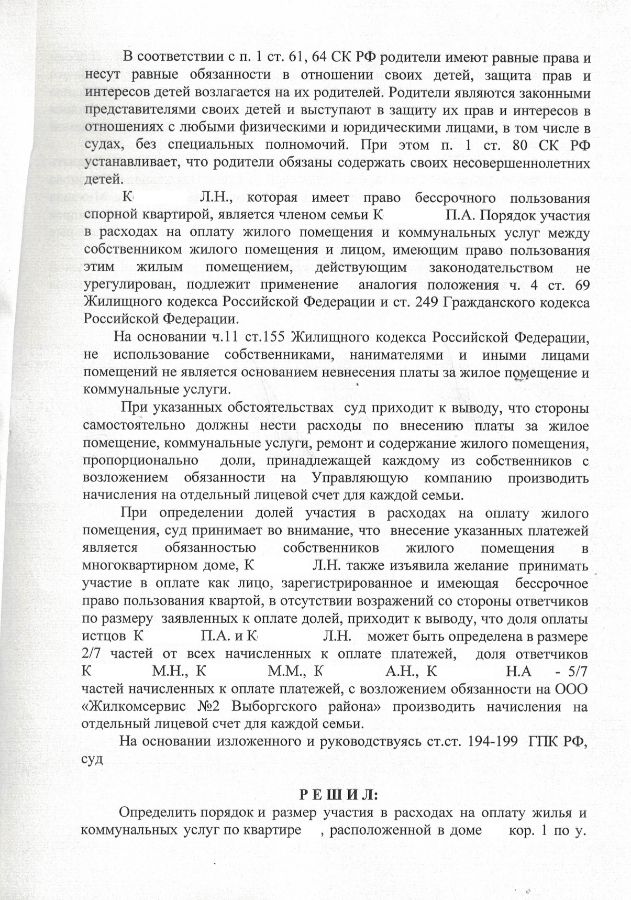 Решение Выборгского районного суда о разделе счетов на оплату коммунальных услуг