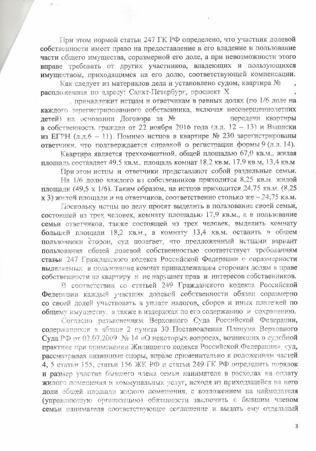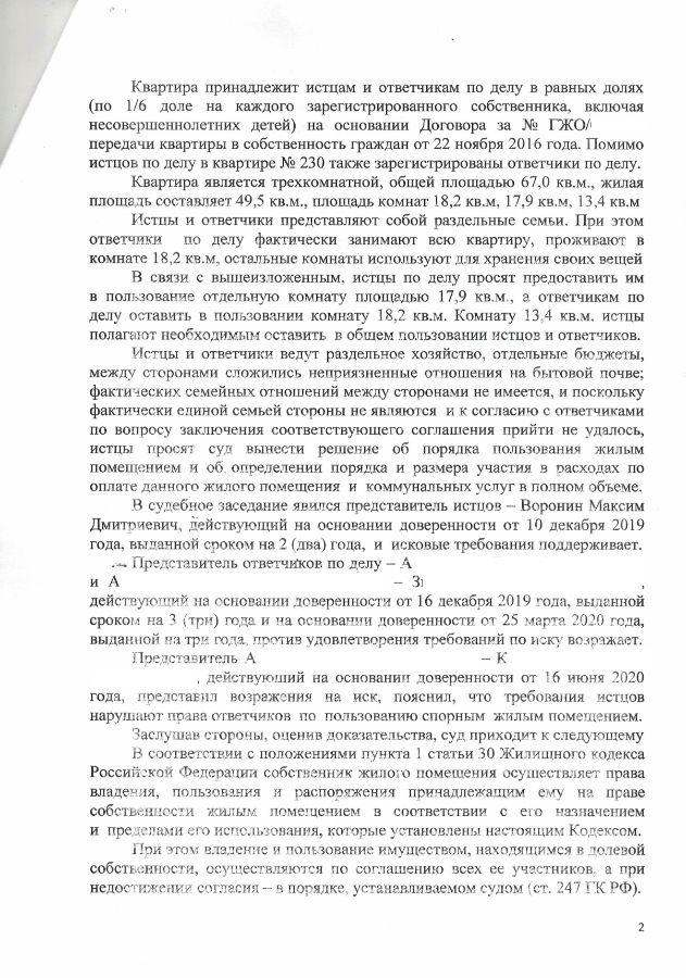 Одна семья заняла в трехкомнатной квартире все комнаты, в связи с чем, вторая семья вынуждена была съехать из квартиры. Вторая семья обратилась ко мне за юридической поддержкой. Был подготовлен иск, посещено несколько судебных заседаний, в результате суд определили в пользование по большой комнате каждой семье, а комнату поменьше оставил в пользовании обоих семей (для хранения вещей).